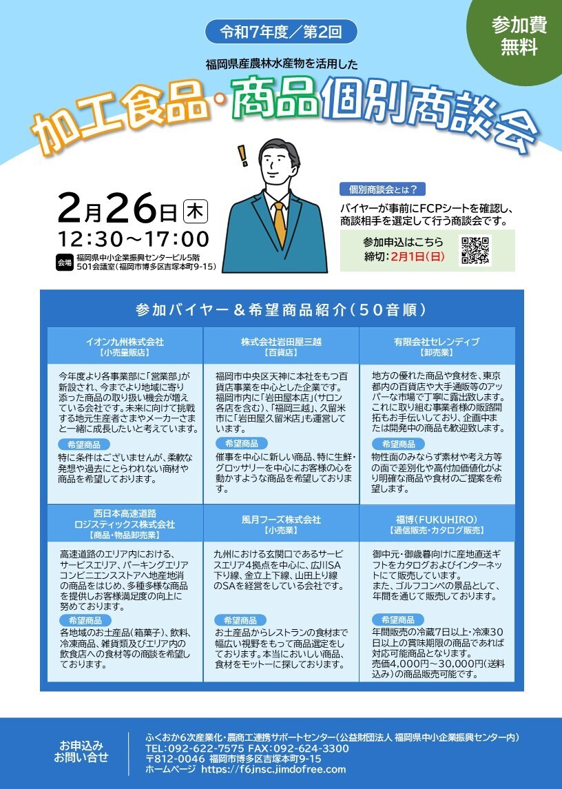 福岡県産の農林水産物を活用した商品の商談会を令和8年2月26日(木)に開催します。事前に福岡県内の優良バイヤーが商品情報を確認するので、スムーズな商談で成約率UPが期待できます!